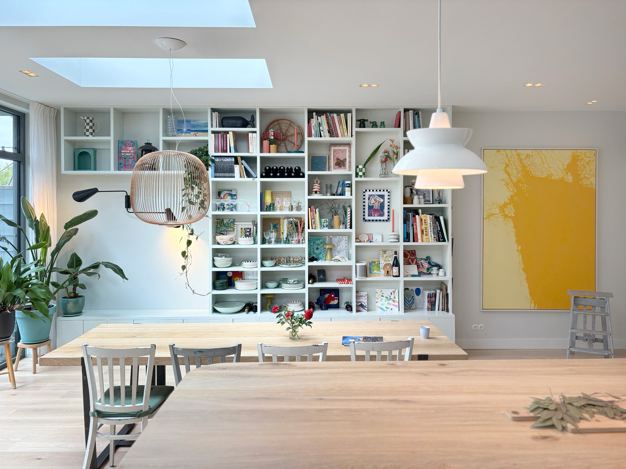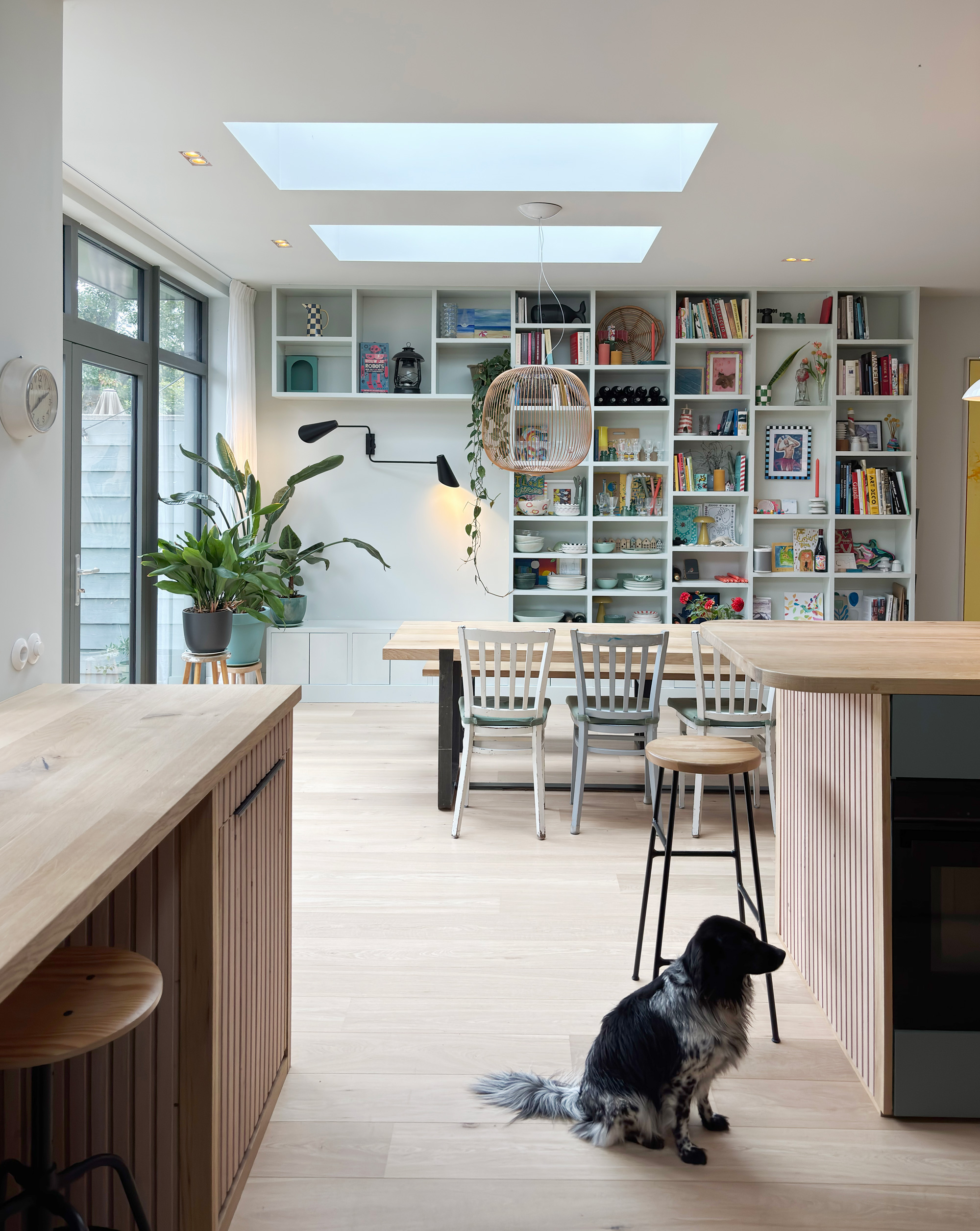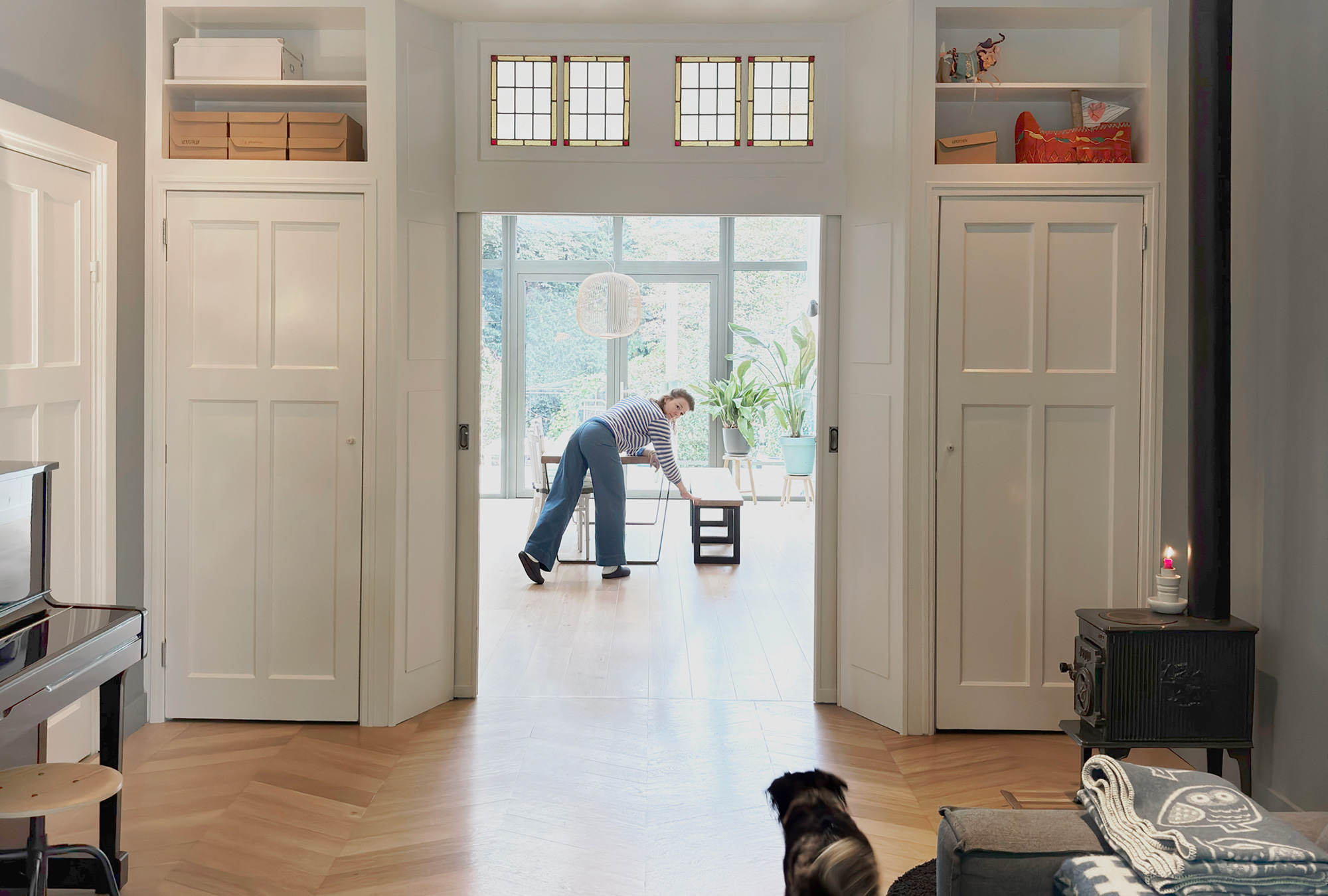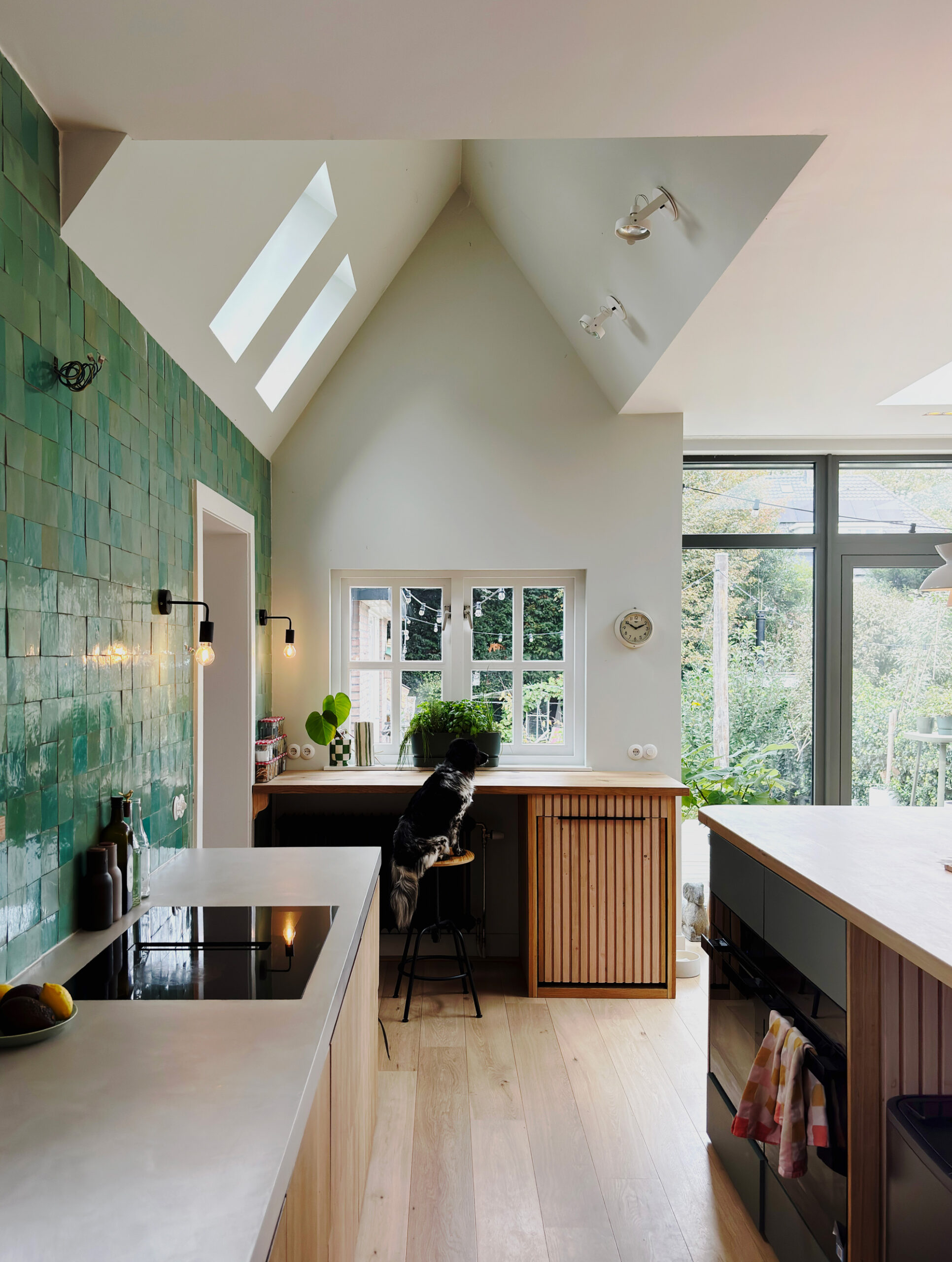Resultaat is een achtergevel die een symbiose vormt van eigentijdse en historische elementen. De aan de binnenkant opengewerkte oorspronkelijke aanbouw, de aanwezigheid van twee verschillende dakvormen, zorgt voor een subtile en speelse zonering van de ruimte.