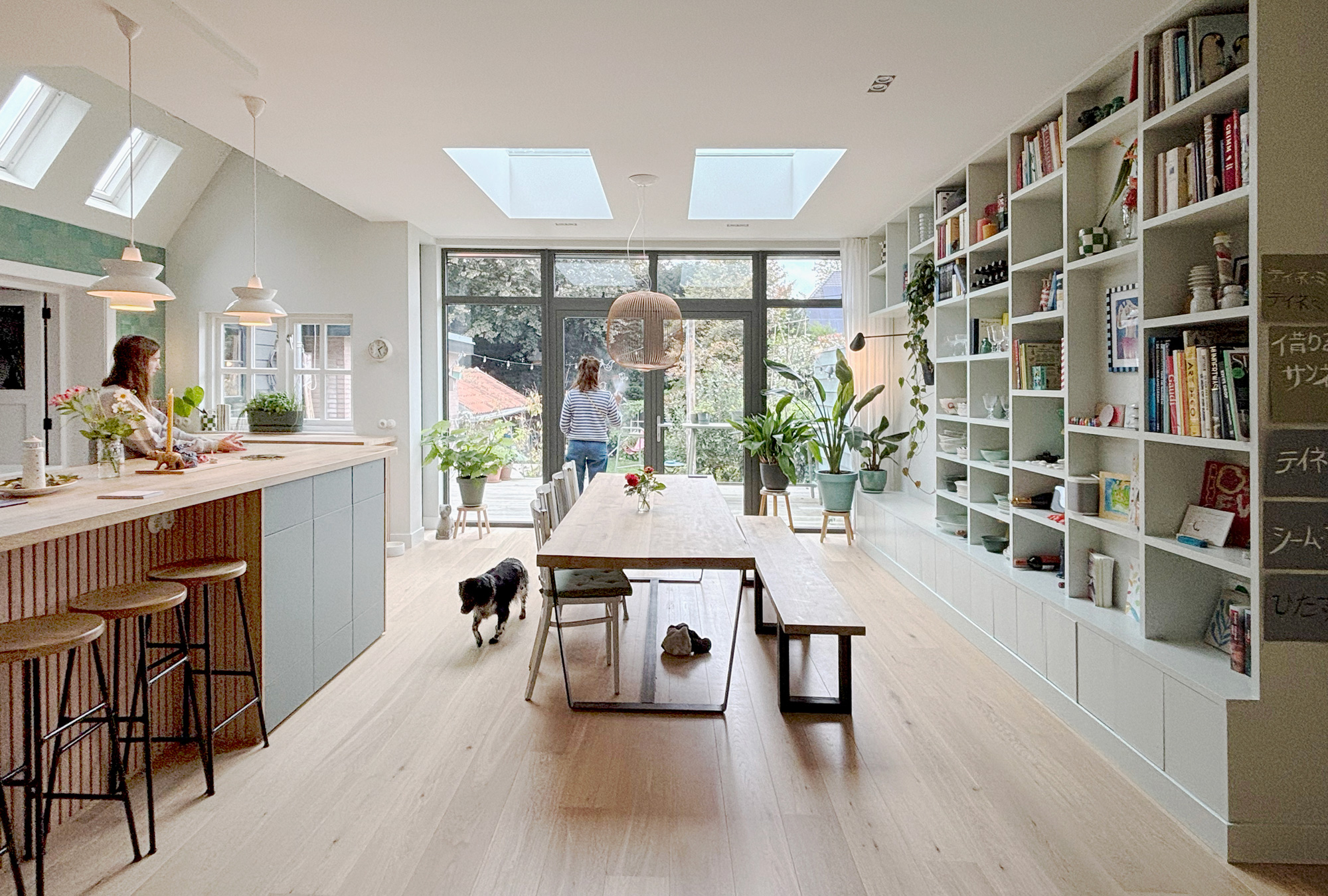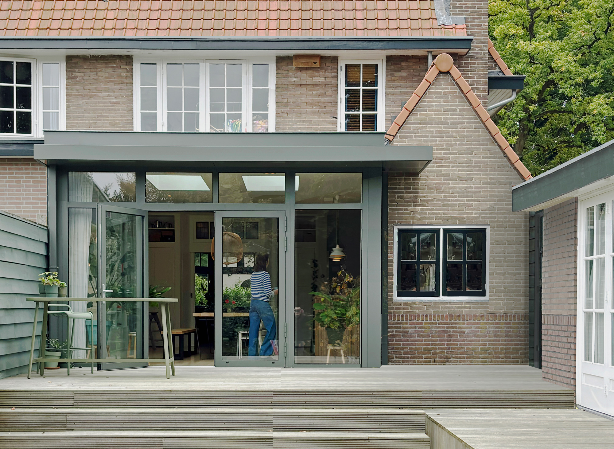 Uiteindelijk is ervoor gekozen om het aanbouw te behouden en de gewenste uitbreiding van de woonruimte te realiseren ter plaatse van het donkere deel van het terras, tussen aanbouw en buurpand in. Qua vormentaal sluit de uitbouw aan bij de al aanwezige bijgebouwen.