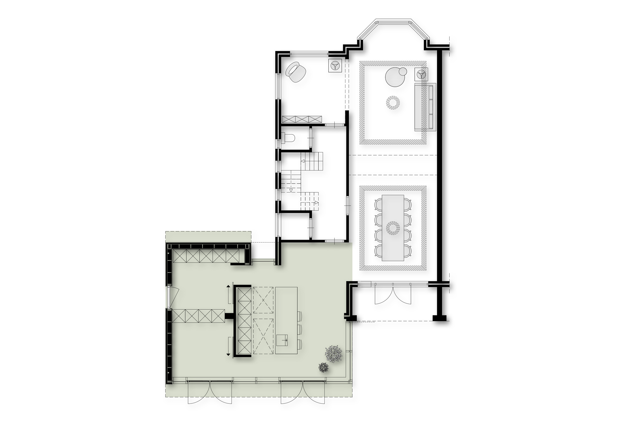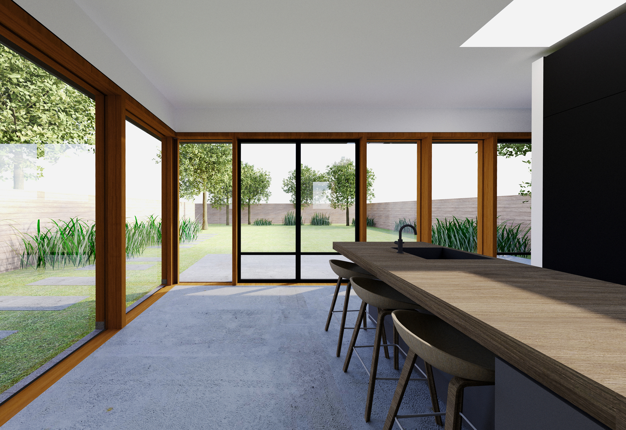 Naast het behoud van authentieke details, blijft ook de bestaande ruimtestructuur intact maar wordt deze uitgebreid met extra vertrekken met een eigen kwaliteit, zoals de intieme tuinkamer en grote, open keuken. Om zowel de groene achtertuin als de diepe voortuin van binnenuit ervaarbaar te maken, is de keuken centraal geplaatst met een 8 meter breedte raampartij aan de tuinzijde en tevens een groot raam aan de voorkant dat zicht biedt op de diepe voortuin en de straat.